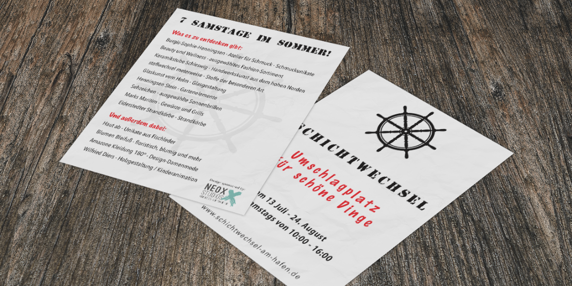 Zahlreiche Schleswiger Unternehmen bieten beim „Schichtwechsel am Hafen“ in Schleswig vom 13. Juli bis 24. August immer samstags von 10-16 Uhr ihre Waren an. Für dieses Projekt haben wir vor Kurzem einen Flyer designt sowie die Webseite gesponsored.