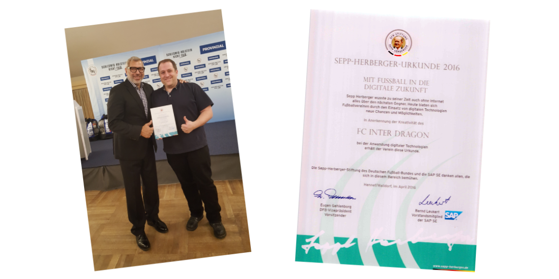 Vor mehr als vier Jahren haben wir an einem Projekt für den FC Inter Dragon gearbeitet, bei dem es um einen digitalen Fußball-Manager ging. Das Projekt erhielt die Sepp-Herberger-Urkunde für die Anwendung digitaler Technologien im Fußball. Überreicht wurde der Preis damals vom ehemaligen Fußballspieler Jimmy Hartwig.
